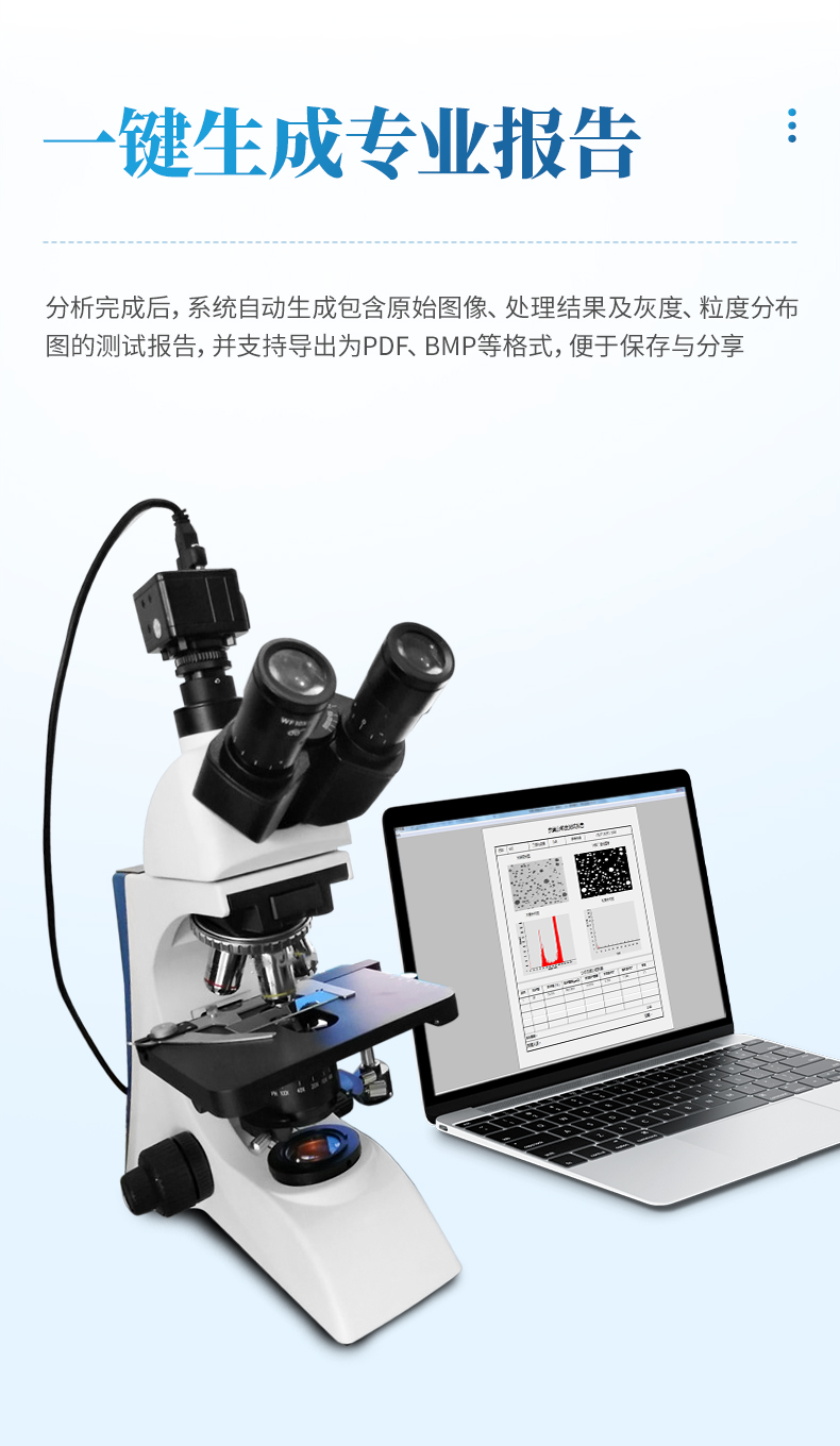 報告報告包括:樣品名稱、二值化閾值、參考標準、原始圖、二值化后圖像、灰度分布圖和粒度分布圖、軟件分析得到的項目參數等。如下圖所示: