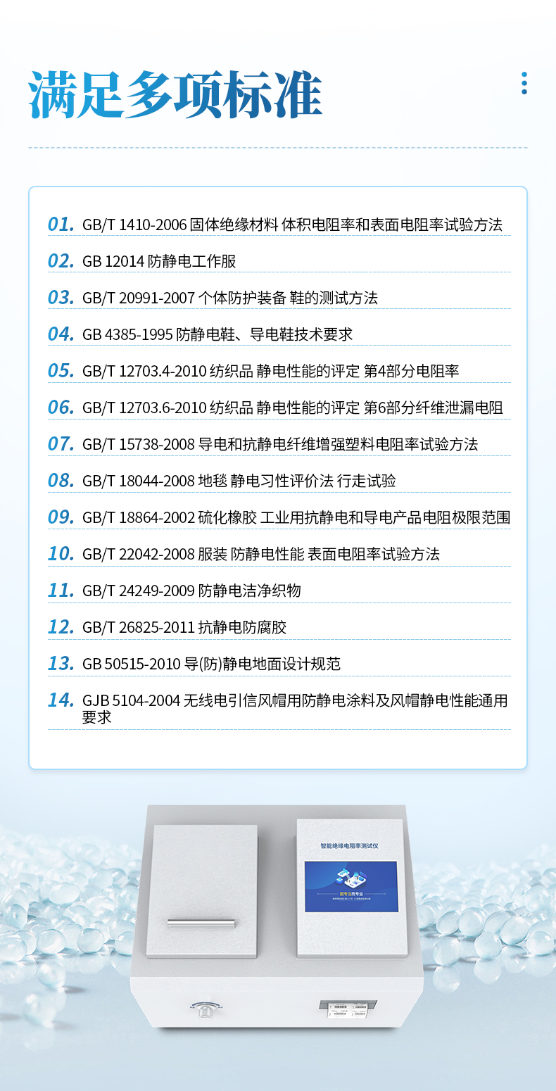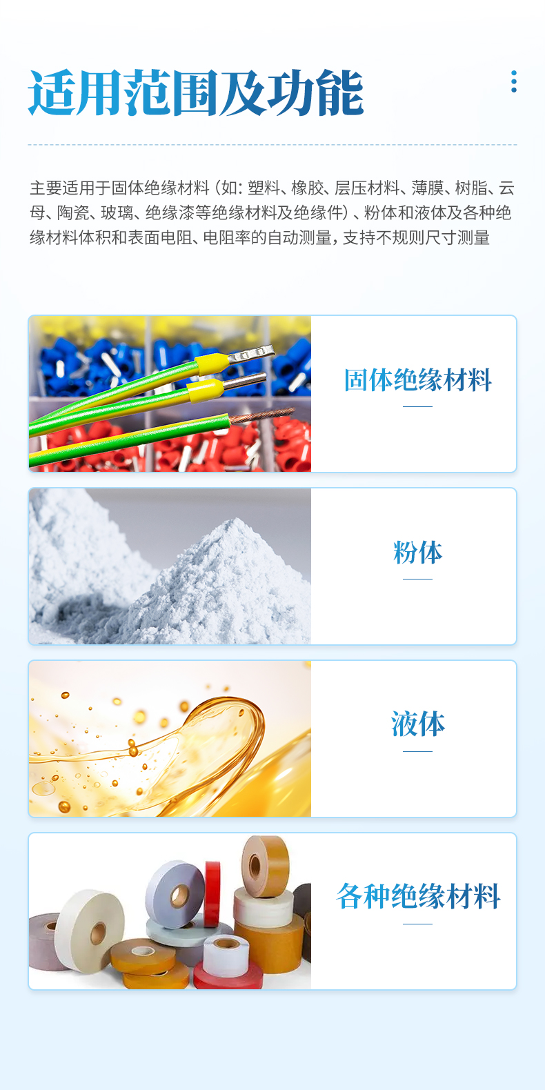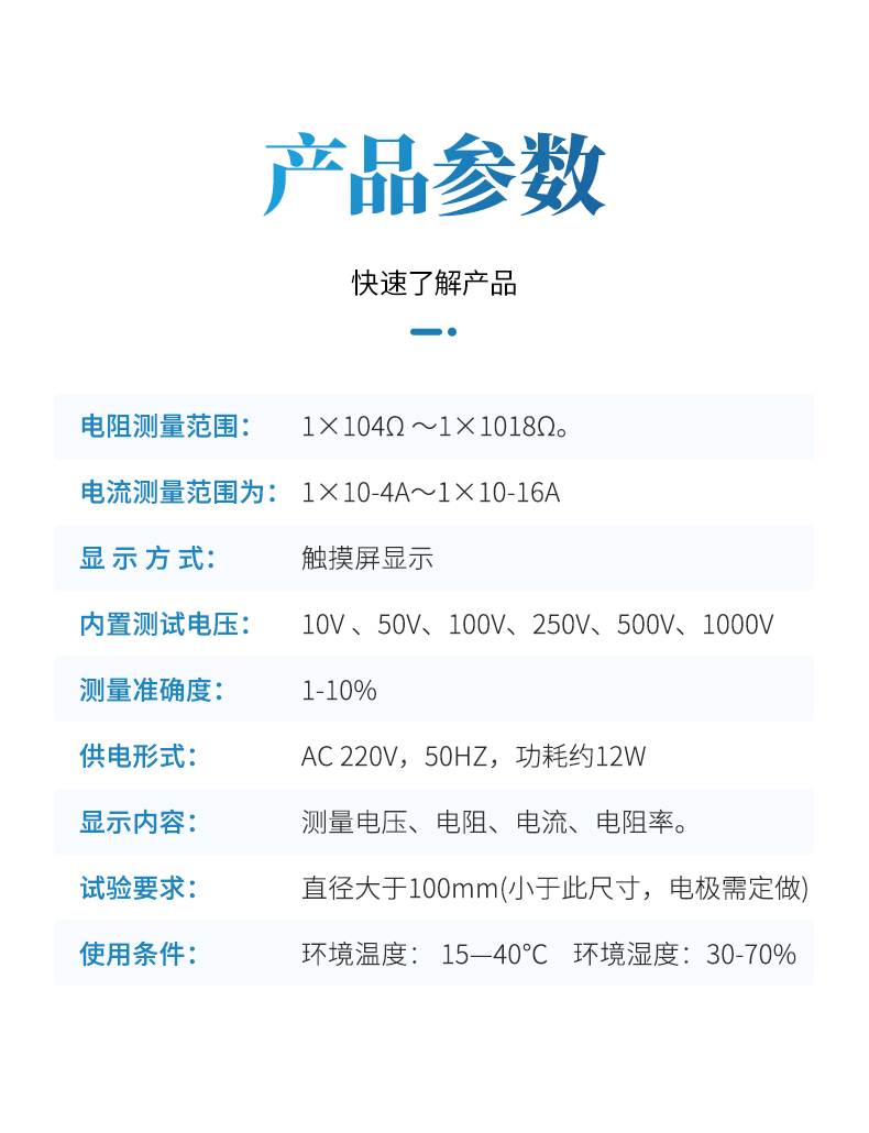 主要適用于固體絕緣材料(如:塑料、橡膠、層壓材料、薄膜、樹脂、云母、陶瓷、玻璃、絕緣漆等絕緣材料及絕緣件)、粉體和液體及各種絕緣材料體積和表面電阻、電阻率的測定。