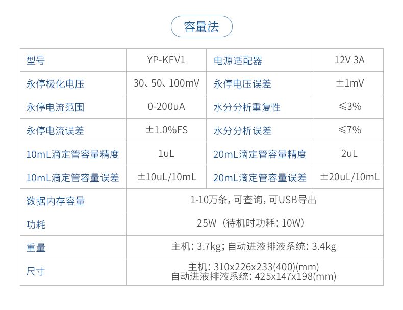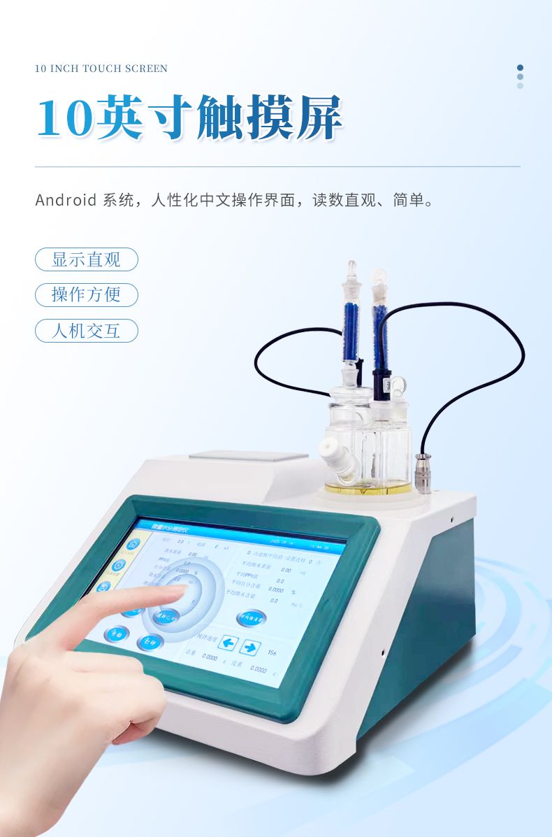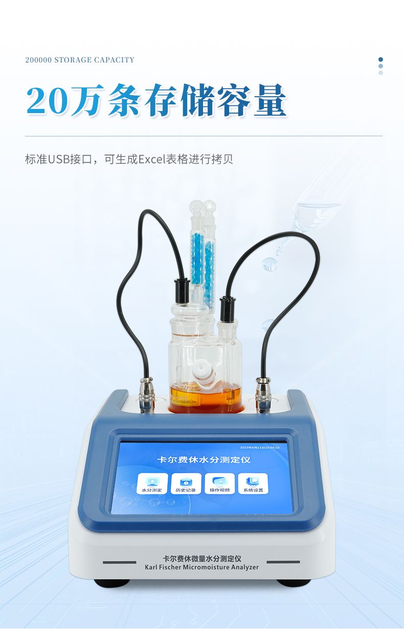 2.儀器具有試驗結果存儲、打印、計算功能;樣品測定過程由儀器自動控制,攪拌、測定60秒左右自動完成,直接顯示測定結果;全密封滴定池瓶,避免試劑與人接觸,也避免環境濕度的影響;并具有自動計算平均值和歷史記錄打印功能,能打印出百分含量、樣品編號、試驗員、實驗日期等內容;儀器準確度為:①水含量小于10微克水時,測量值誤差小于2ug水;②水含量在10微克-1000微克水時,測量誤差≤2ug水;③水含量在1000微克以上時,測量值誤差≤0.2%(不含進樣誤差);
