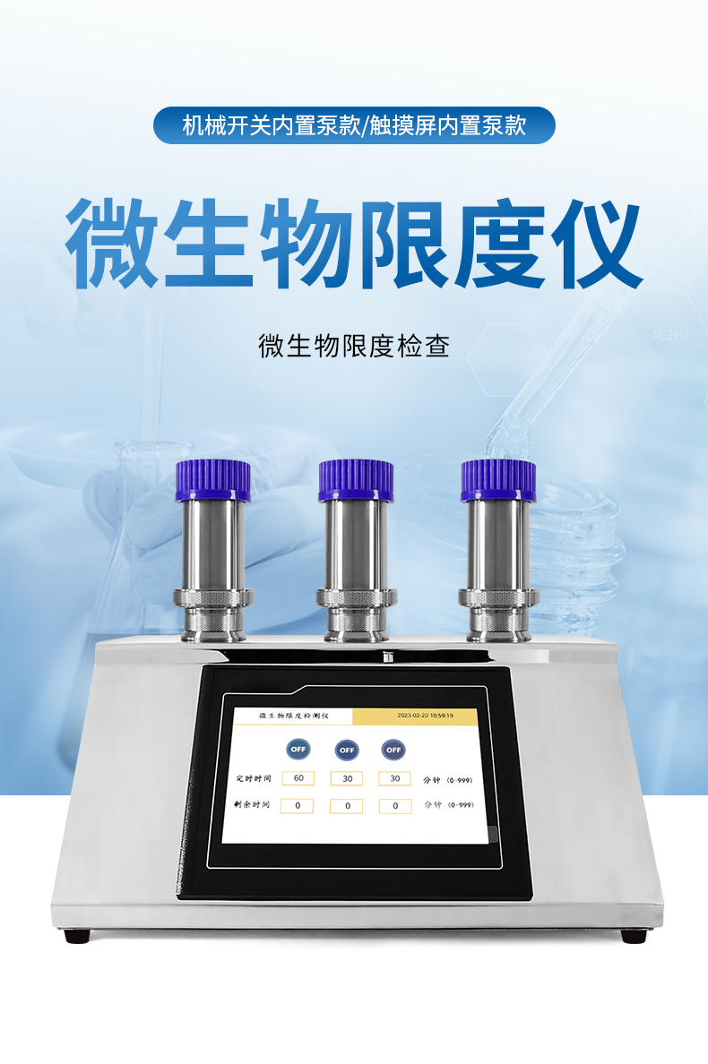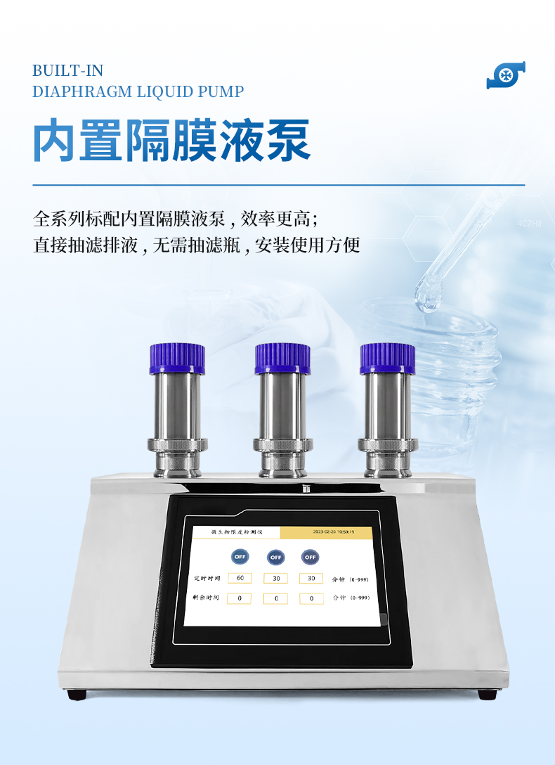 微生物限度檢測儀(微生物薄膜過濾器)采用不銹鋼金屬材料制成,配有內置隔膜液泵,不需外接抽濾瓶,液體直接通過隔膜液泵排除,減少了抽濾瓶使用上的繁瑣,避免了連接不好造成抽濾速度慢等缺點。