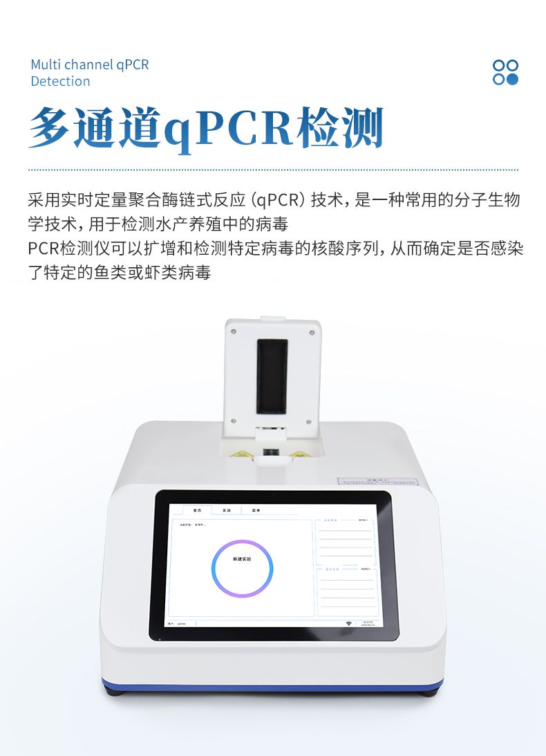 魚蝦病毒檢測儀采用實(shí)時定量聚合酶鏈?zhǔn)椒磻?yīng)(qPCR)技術(shù),是一種常用的分子生物學(xué)技術(shù),用于檢測水產(chǎn)養(yǎng)殖中的病毒。PCR檢測儀可以擴(kuò)增和檢測特定病毒的核酸序列,從而確定是否感染了特定的魚類或蝦類病毒。