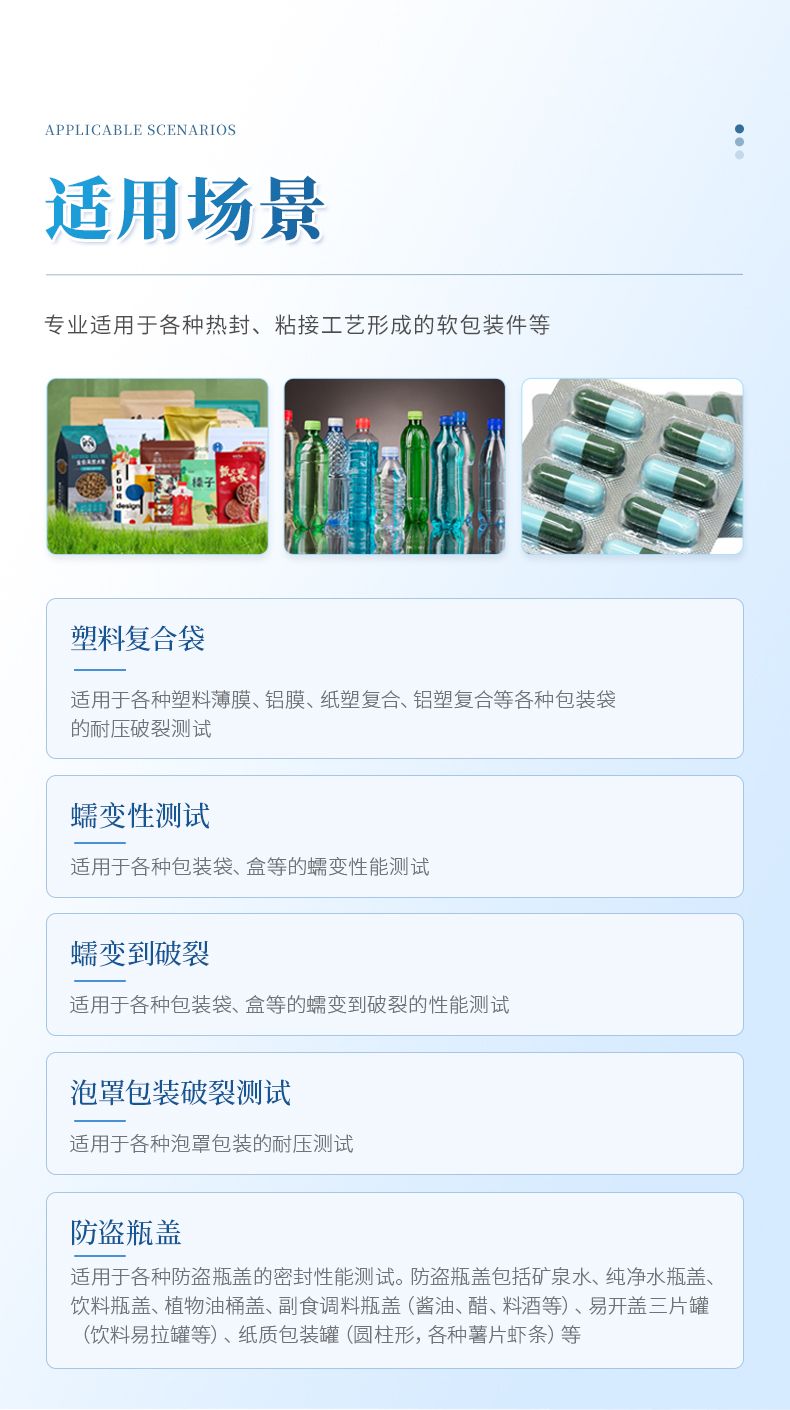 | 塑料復(fù)合袋 | 適用于各種塑料薄膜、鋁膜、紙塑復(fù)合、鋁塑復(fù)合等各種包裝袋的耐壓破裂測(cè)試 |