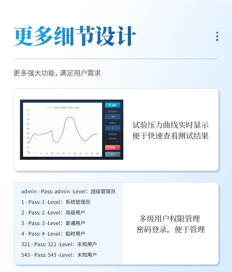 4. 試驗(yàn)曲線實(shí)時(shí)展示試驗(yàn)過程中壓力的變化趨勢(shì),試驗(yàn)數(shù)據(jù)智能統(tǒng)計(jì);