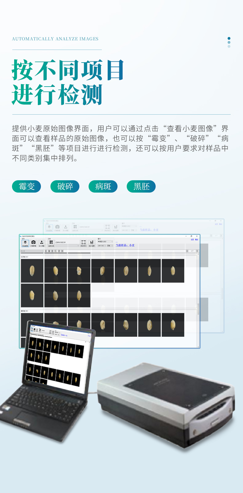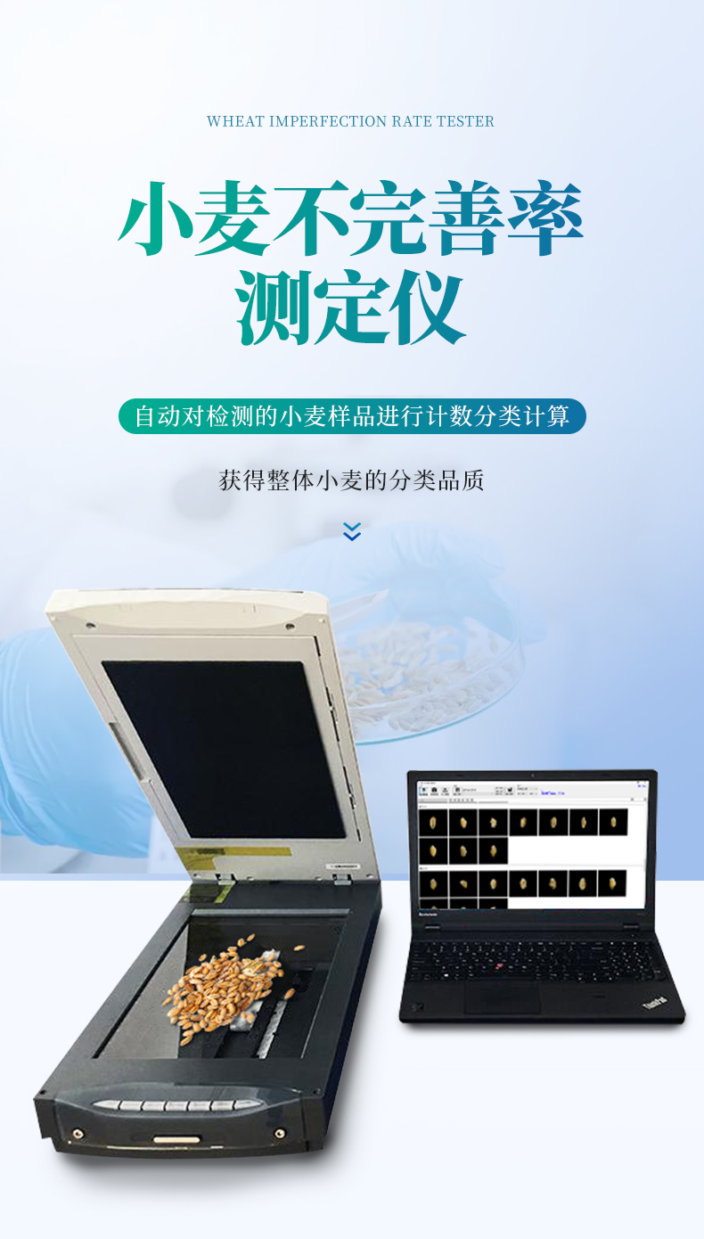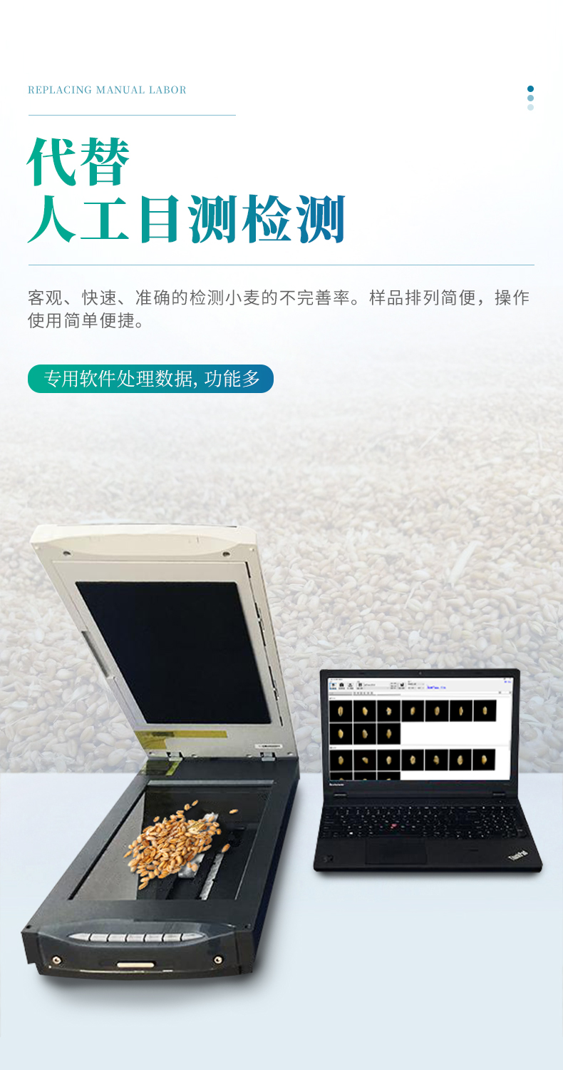 小麥不完善軟件連接專用掃描儀,掃描出小麥正反兩面的電子照片,通過軟件識別自動對檢測的小麥樣品進行計數分類計算。從而獲得整體小麥的分類品質。