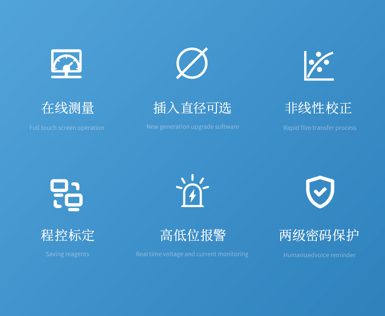 插入直徑可選,各種插入直徑的膜透器有多種插入長度可選。儀器具有非線性校正,程控標定,高低位報警,兩級密碼保護重要數據和菜單組態等功能。