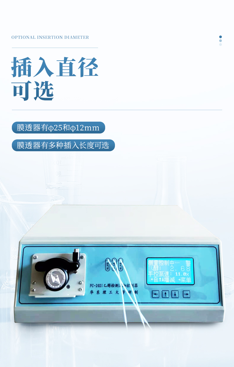 在線測量發酵液中乙醇濃度,膜透器選用了不銹鋼絲網增強的高分子乙醇透過膜,可直接蒸汽滅菌。檢測傳感器工作在恒溫器中,克服了傳感器響應的環境溫度影響。膜透器有φ25和φ12mm