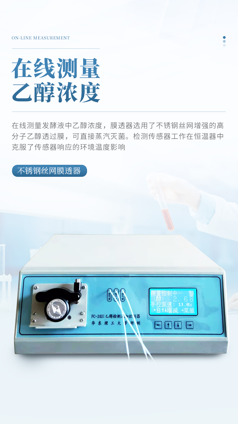 FC2021型乙醇檢測流加控制器是由單片微型計算機控制的智能化儀表。主要用于發酵過程中乙醇濃度的在線檢測和流加控制。