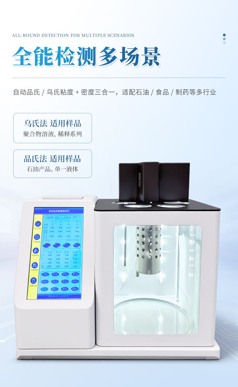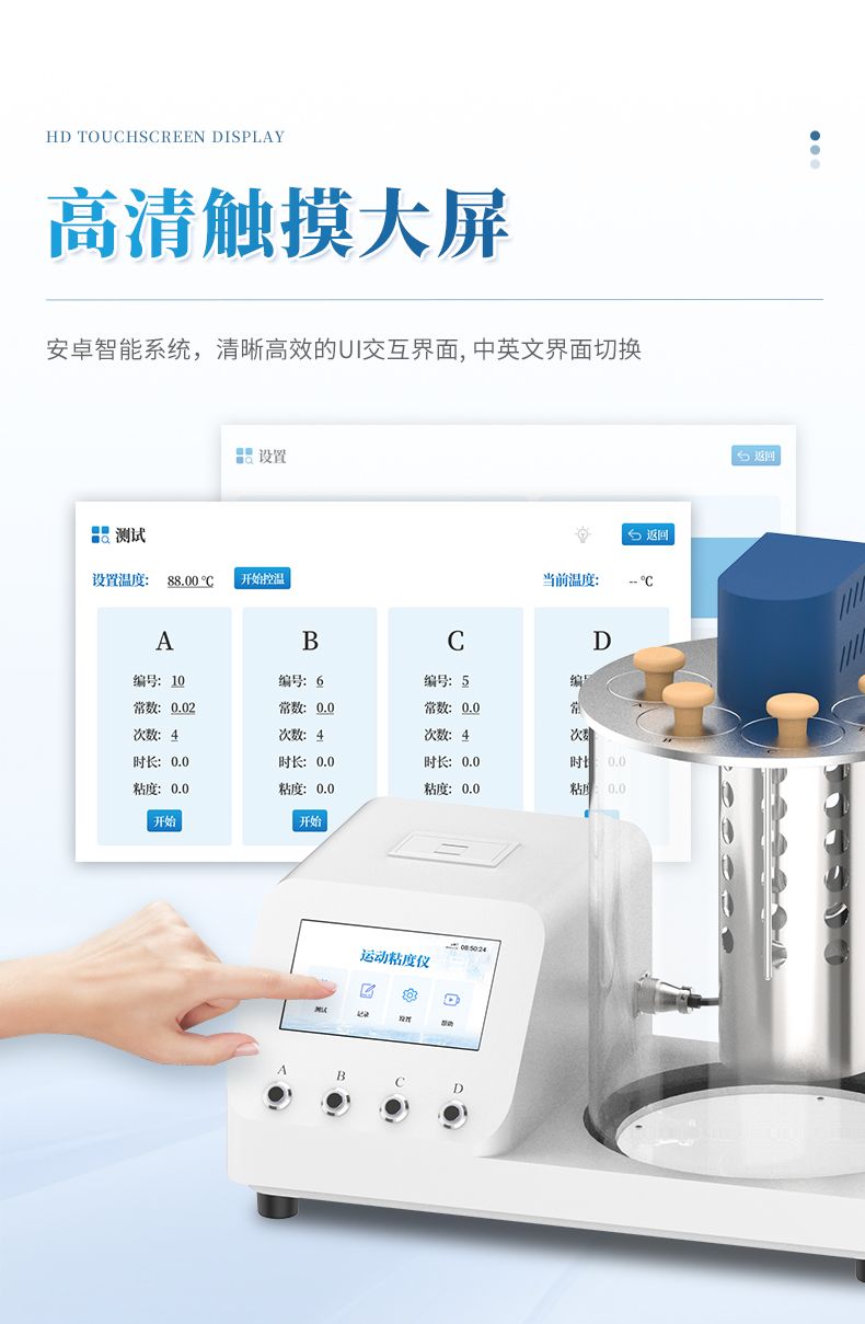 本產品石油產品運動粘度自動測定儀是依據國家標準《GB265-88石油產品運動粘度測定法》設計制造的專用測試儀器,適用于測定液體石油產品的運動粘度。本儀器具有計時試樣運動時間,自動計算運動粘度的最終結果。本方法適用于測定液體石油產品(指牛頓液體)的運動粘度,其單位為m2/s,通常在實際中使用為mm2/s。動力粘度可由測得的運動粘度乘以液體的密度求得。本方法是在某一恒定的溫度下,測定一定體積的液體在重力下流過一個標定好的玻璃毛細管粘度計(品氏、烏氏)的時間,粘度計的毛細管常數與流動時間的乘積,即為該溫度下測定液體的運動粘度。該溫度下運動粘度和同溫度下液體的密度之積為該溫度下的動力粘度。