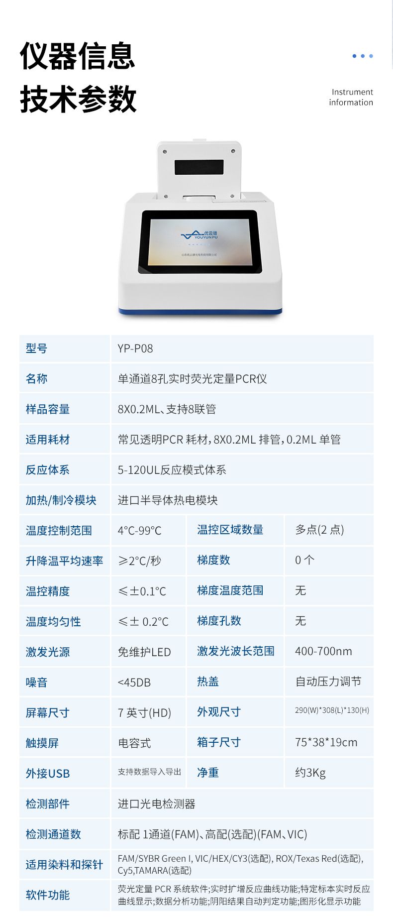 YP-P48型號 實時熒光定量PCR系統主要用于運行實時熒光定量PCR實驗,通過熒光激發和采集的方式,對實驗過程進行實時監控,將實驗過程數據繪制成熒光曲線,實時呈現于儀器顯示界面,并對實驗數據進行擬合和分析,最后可生成PDF格式的實驗報告。