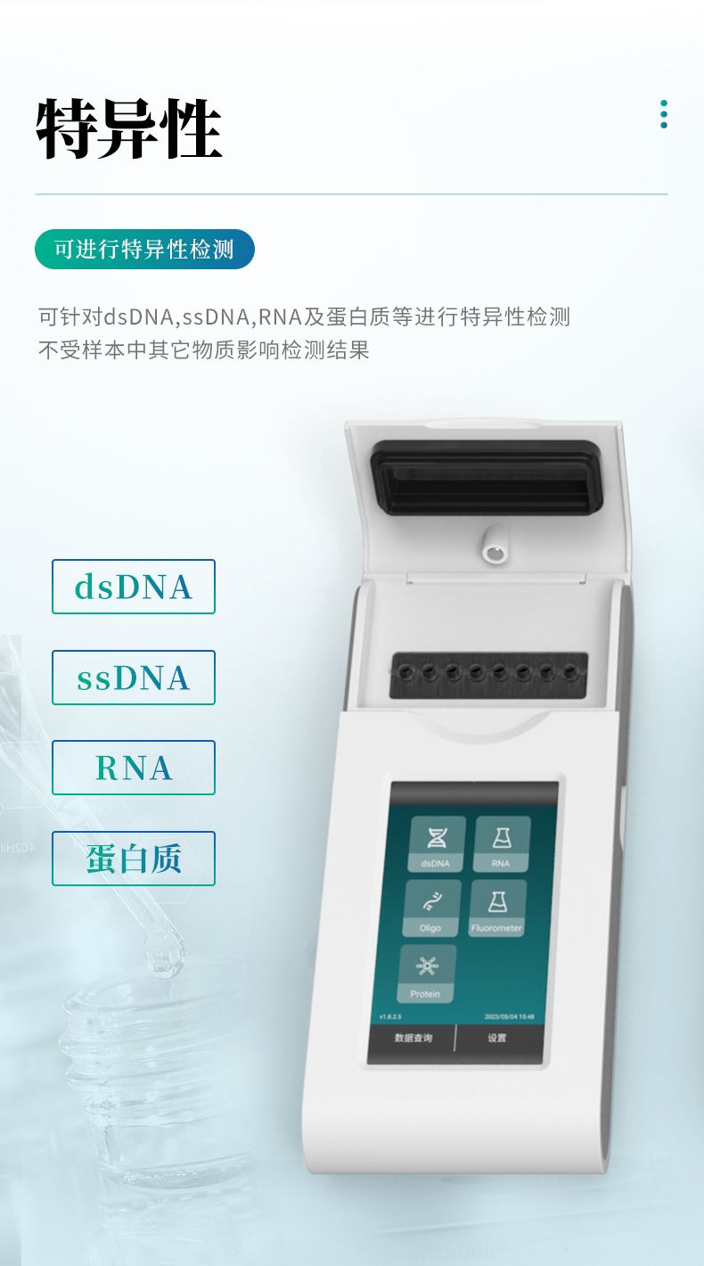 熒光計(jì)采用熒光檢測(cè)原理,上樣體積僅需1-20ul,配合相應(yīng)的定量試劑即可實(shí)現(xiàn)精確濃度定量。熒光計(jì)為開放平臺(tái),可靈活 適配不同試劑品牌,如Qubit? dsDNA 定量試劑盒, ssDNA 定量試劑盒,RNA 定量試劑盒, microRNA定量試劑盒等,以 及其它品牌適配Qubit? 4設(shè)備的定量試劑盒。