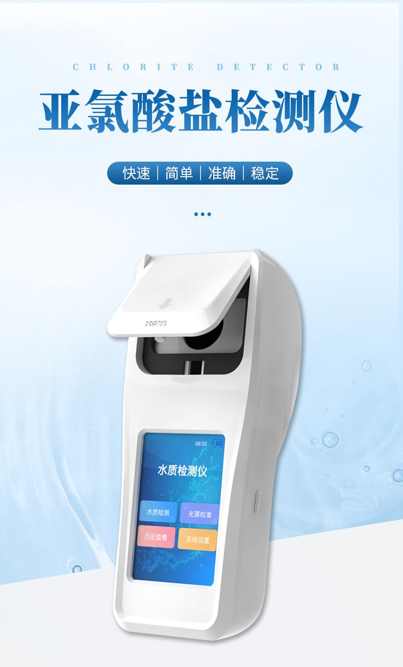 亞氯酸鹽是投放二氧化氯消毒劑后的副產物,超標對人有致癌作用。便攜式亞氯酸鹽檢測儀器配合快速顯色檢測試劑,可“快速、簡單、準確、穩定”進行測量,擁有精美的外觀造型,簡單的操作界面,準確的檢測系統,幫助用戶獲得精細的數據,可更準確、有效的分析水體狀況。