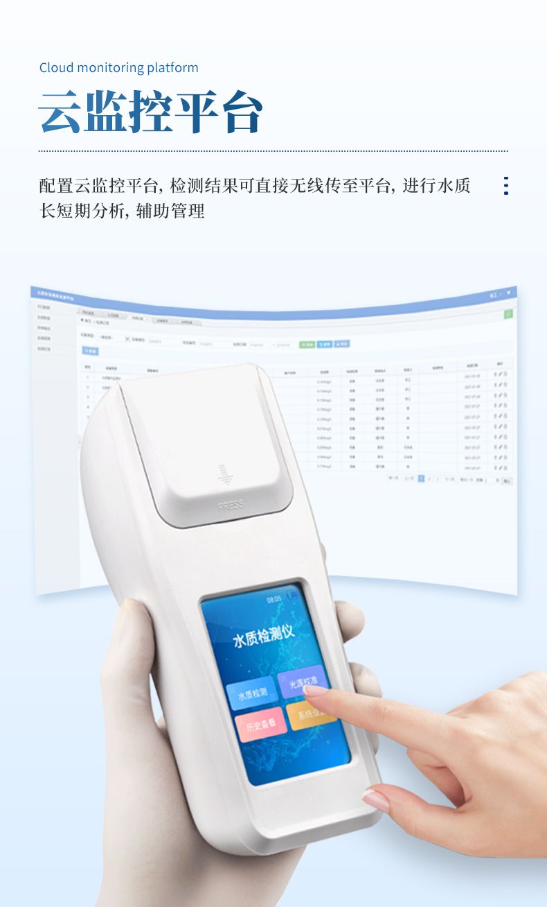 ②配置云監控平臺,檢測結果可直接無線傳至平臺,進行水質長短期分析,輔助管理。