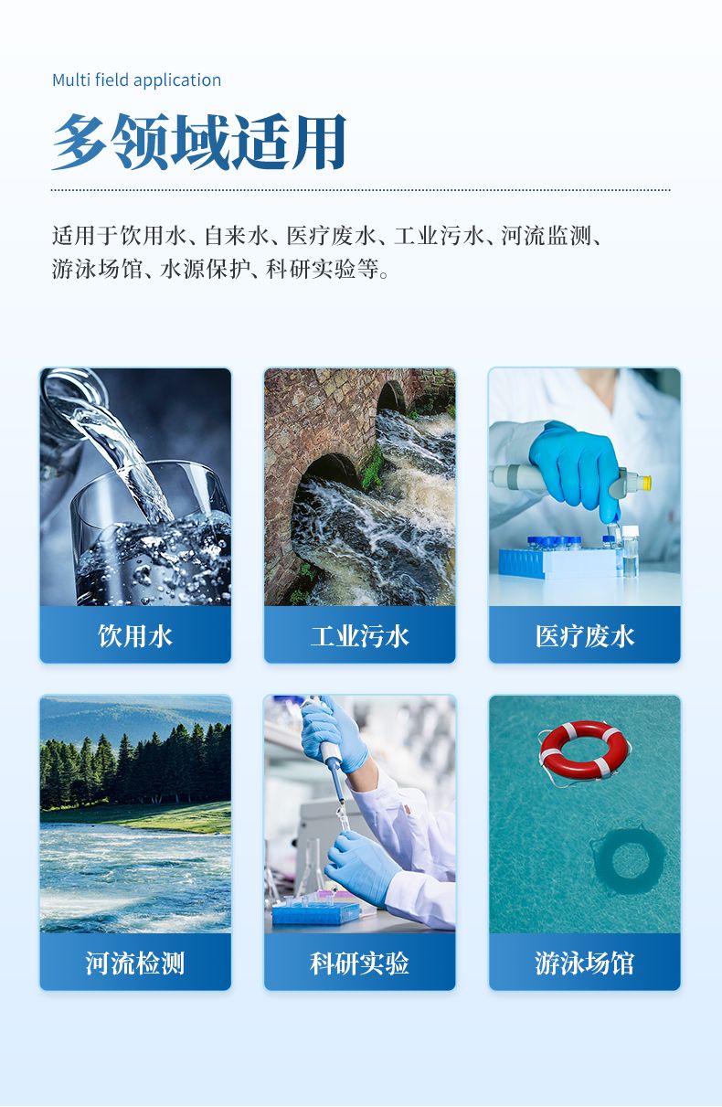 適用于飲用水、自來水、醫療廢水、工業污水、河流監測、游泳場館、水源保護、科研實驗等。