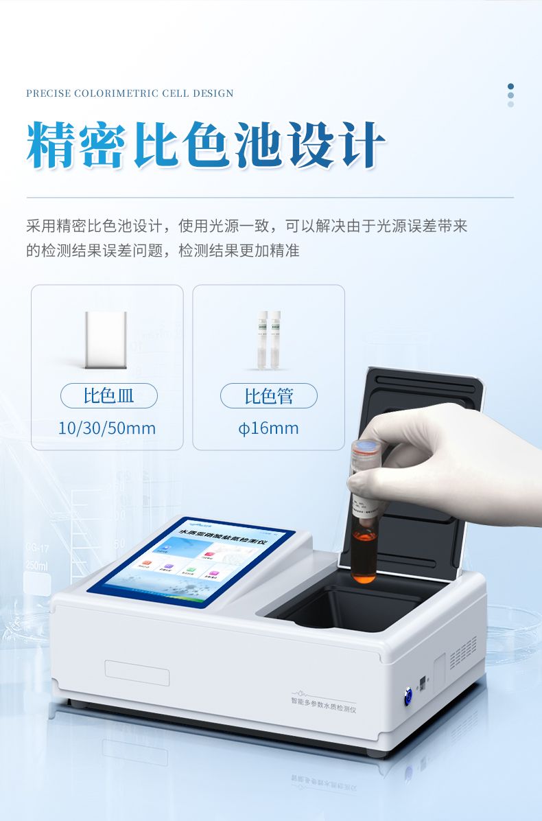 3、采用精密比色池設計,使用光源一致,可以解決由于光源誤差帶來的檢測結果誤差問題,檢測結果更加精準。