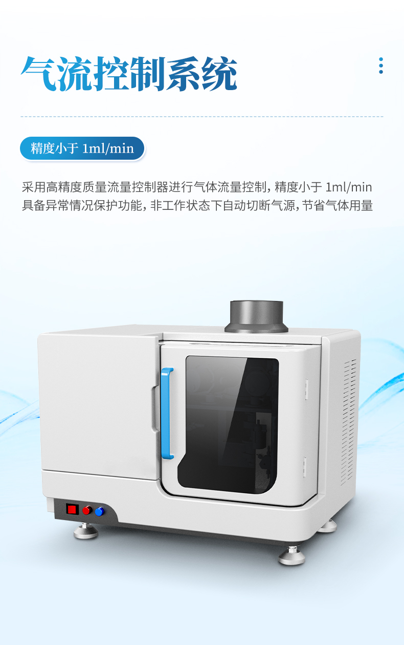 儀器采用高精度質量流量控制器進行氣體流量控制,精度小于 1ml/min。同時具備異常情況保護功能,儀器非工作狀態下自動切斷氣源,節省氣體用量。