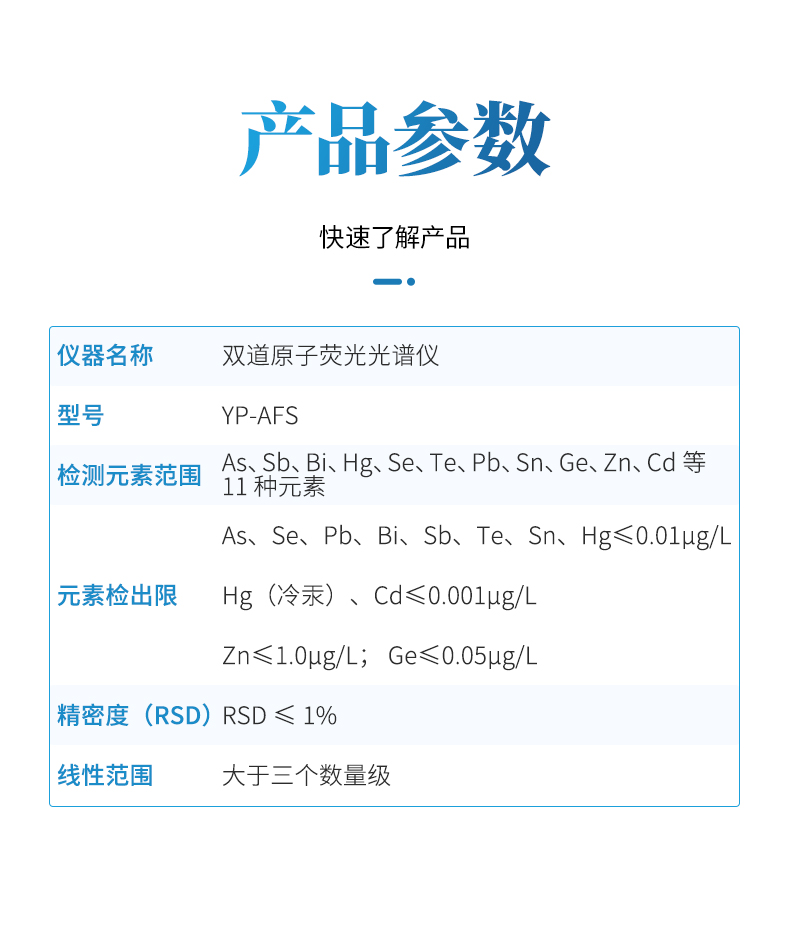 雙道原子熒光光譜儀廣泛應用于汞(Hg)、砷(As)、銻(Sb)、鉍(Bi)、硒(Se)、碲(Te)、鎘(Cd)、鍺(Ge)、鉛(Pb)、錫(Sn)、鋅(Zn)等11 種元素的痕量、超痕量分析,體積小巧,性能穩定,操作簡單。
