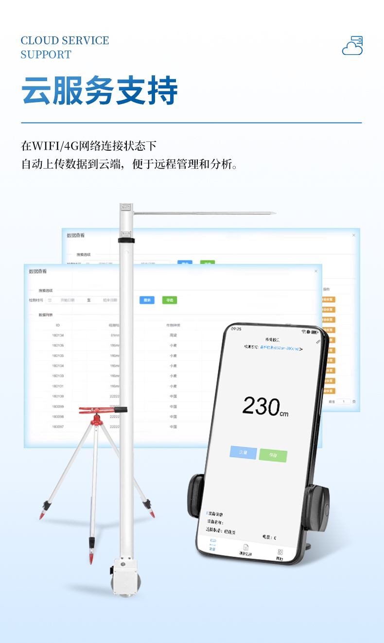10.廣泛應(yīng)用性 - 最低測量高度0.05米,最大測量高度2.6米,適用于大多數(shù)類型的農(nóng)作物株高測量需求。