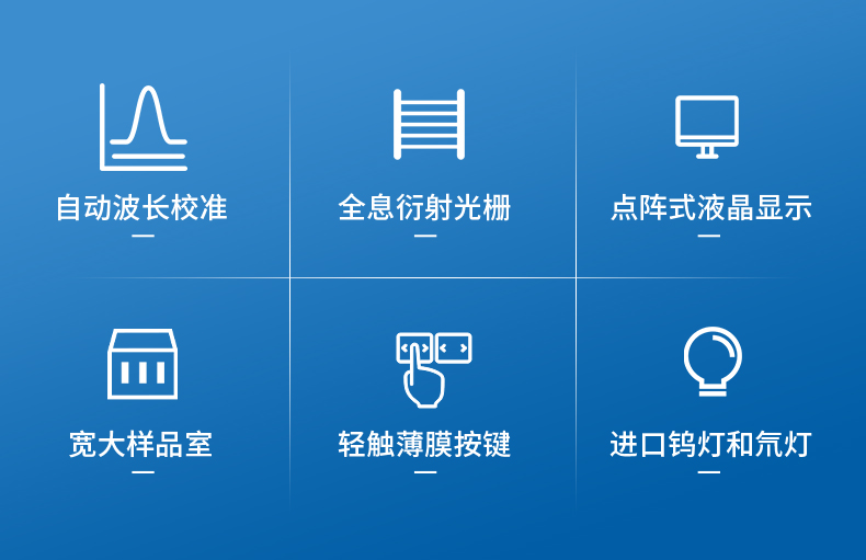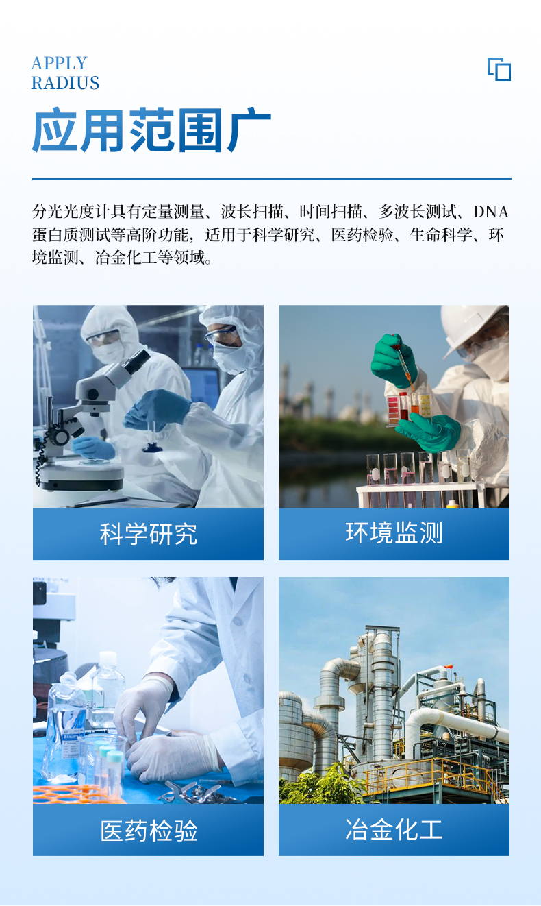紫外可見分光光度計(jì)具有定量測量、波長掃描、時間掃描、多波長測試、DNA蛋白質(zhì)測試等高階功能,具有高精度、高分辨率、低噪聲、低雜散光的特點(diǎn),特別適用于科學(xué)研究、醫(yī)藥檢驗(yàn)、生命科學(xué)、環(huán)境監(jiān)測、冶金化工等領(lǐng)域。
