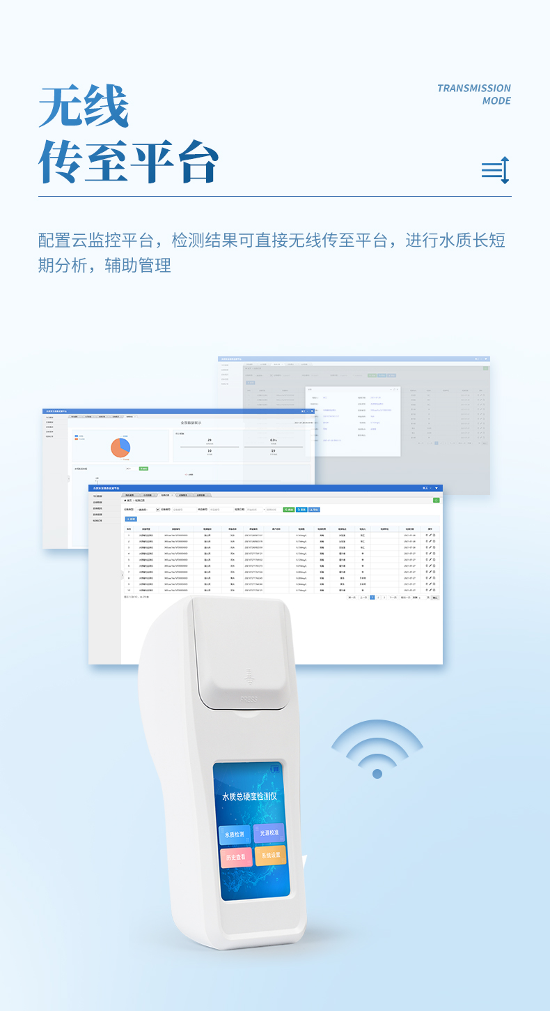 ②配置云監控平臺,檢測結果可直接無線傳至平臺,進行水質長短期分析,輔助管理。