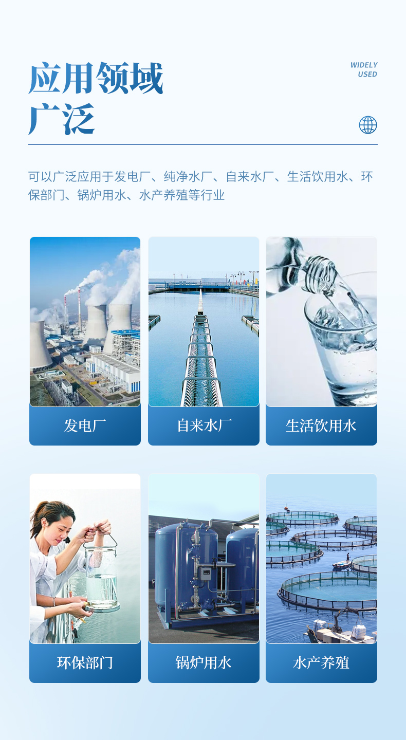 可以廣泛應用于電力行業、工業用水、自來水廠、生活飲用水、石油化工、農業灌溉、飲料食品制造業等行業。