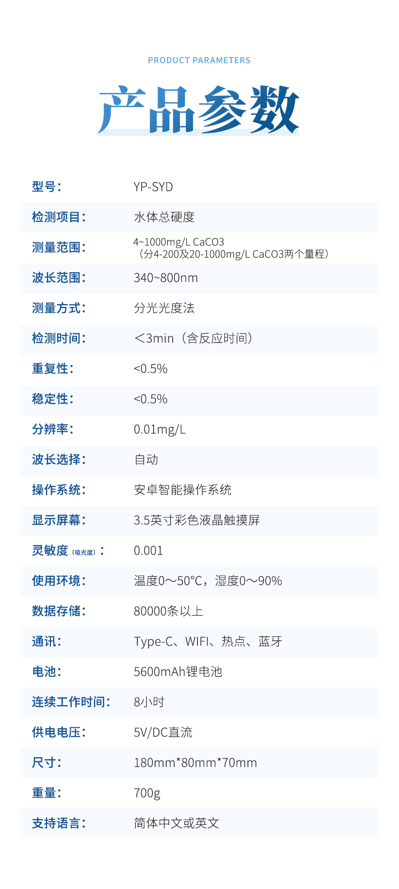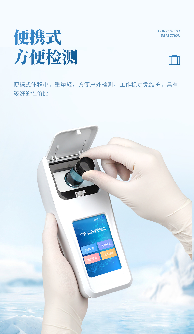 水質總硬度檢測儀可簡單快速測試水質中總硬度濃度值。利用比色法原理配合總硬度檢測試劑快速準確測試水中總硬度含量。